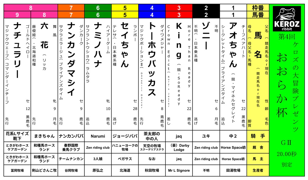 📢【ケロズの大冒険プレゼンツ 第4回〈おおらか杯〉 出走手当総額 83,147円!✨】
